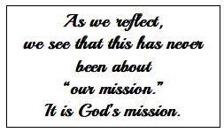 As we reflect, we see that this has never been about “our mission.” It is God’s mission. Our Heavenly Father sent His Son, Jesus Christ, into the world-full of grace and truth (John 1:14). And He sends us, His church, empowered by the Spirit, to love, to serve, and to proclaim the Gospel.