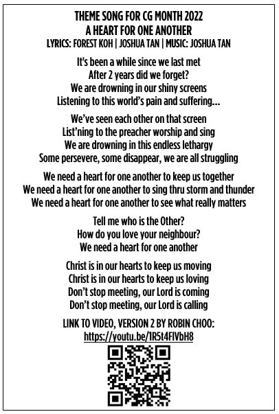 I believe God has put the love for our neighbors in our heart. Perhaps, it is in our busyness that this love has slowly faded away; it is our fast-moving pace that blinded our eyes. The pandemic slowed us down and brought us closer together and back to the gospel -- the love for our neighbours. And this, is the spirit of CG: to love one another and to extend our love to our neighbours.