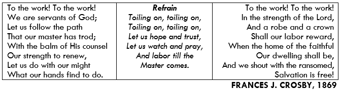 The Hymn – “TO THE WORK” is a familiar song sung by Glory Church over the decades. This hymn written by Fanny Crosby some 150 years ago still resonates with me whenever we sing it during our worship service.