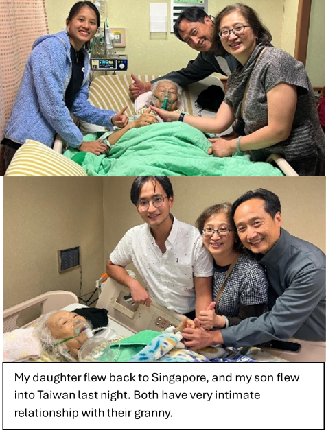 Her hip surgery was done just three days after the stent insertion, and medically, it went very well. But a few days later, her condition worsened. Her heart grew weaker. Her kidneys began to fail. Last Friday, her breathing became difficult and she drifted in and out of consciousness. When my wife messaged me about a sudden drop in her heart rate, my daughter and I booked the earliest flight and flew to Kaohsiung overnight.